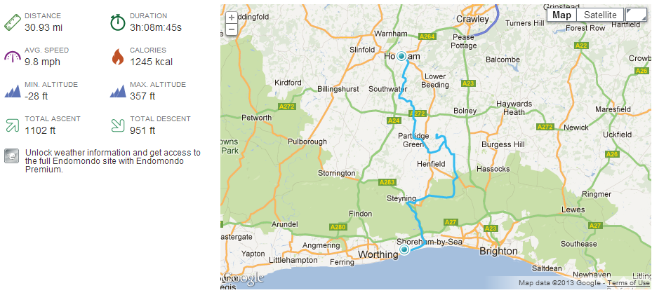 The rest of the trip was….wet! I also noticed that Horsham seems to sit on a bit of a hill when you come from the south, nothing you would normally notice but being wet and cold on the bike I really did notice it! A stop off in Horsham to eat my lunch (it managed to keep dry) and to change my now soaking fleece with a waterproof top. It is strange that while you are on the move you don’t notice how wet you are getting, possibly helped by it being quite warm. My waterproof trousers were keeping that side of things dry, but after stopping I suddenly notice how wet my top half was getting. I pondered for a bit, the train station was just a mile away and it would be warm and dry on a train… At the same time though, the GPS told me it was just 20 or so miles back home and I remembered a train journey meant changing at least three times and the likelyhood of it taking most of the rest of the day. I put ideas of wimping out of my head and headed home.