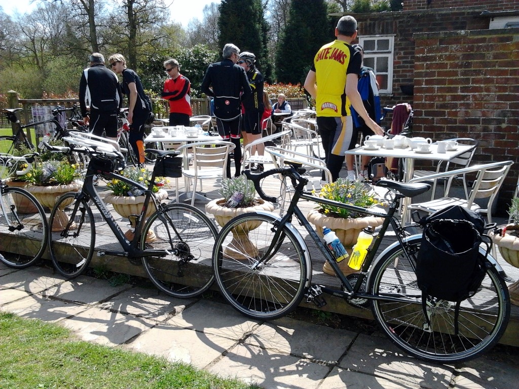 We hit a number of long hills, nothing steep but a constant upward trend which reminded me of the ride into Horsham earlier on in the year which seemed to be just one slow uphill struggle.   I was then pretty pleased when we got to our tea stop at a strange furniture store set in the middle of nowhere it seemed.   The store was strange in that the restaurant and grounds  seemed to be a much bigger  attraction when the furniture on offer which seemed to be mostly “reclaimed” and “vintage” which meant mostly tat but with an extra zero added to the price list.   The restaurant however was a different story and seemed reasonably priced, not that I spent more than a price of a pot of tea.  I had bought my own food and I smuggled it to my table while we all sat outside in the sun which was now starting to give a bit of warmth.    A place to remember (if I can work out just where we were) for future visits I thought.