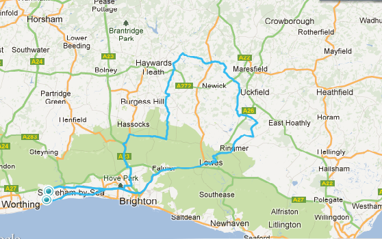 I got to Lewes and met the others where we all decided it was cold in the shade.  We set off, this time doing the route anti-clockwise which would give me the opportunity to slip off near the end homeward in order to save the trial of the Lewes to Falmer section of the ride home.   For the first hour the speed was pretty good along roads that I never knew were really there but in directions that I knew vaguely where I was going.