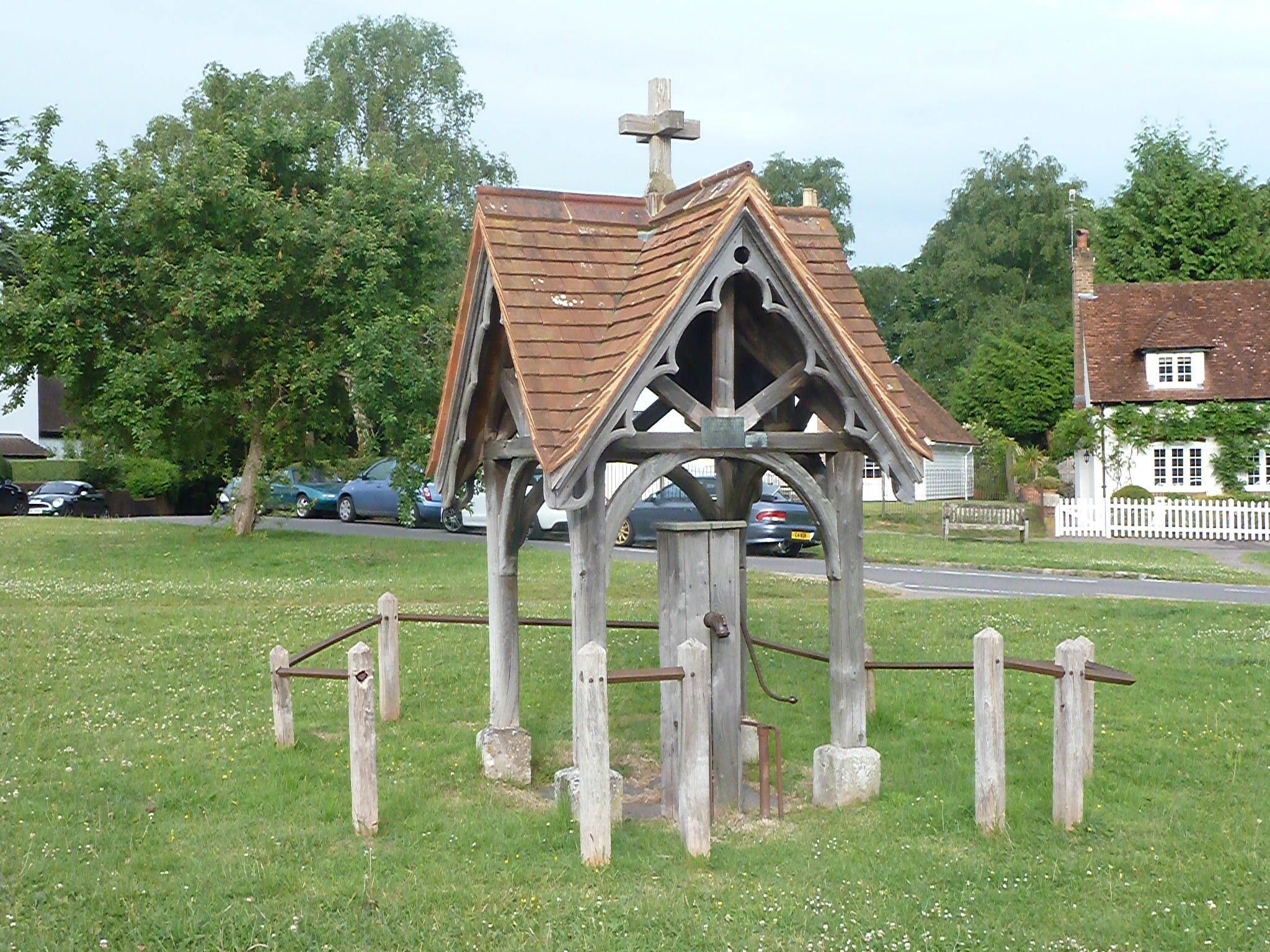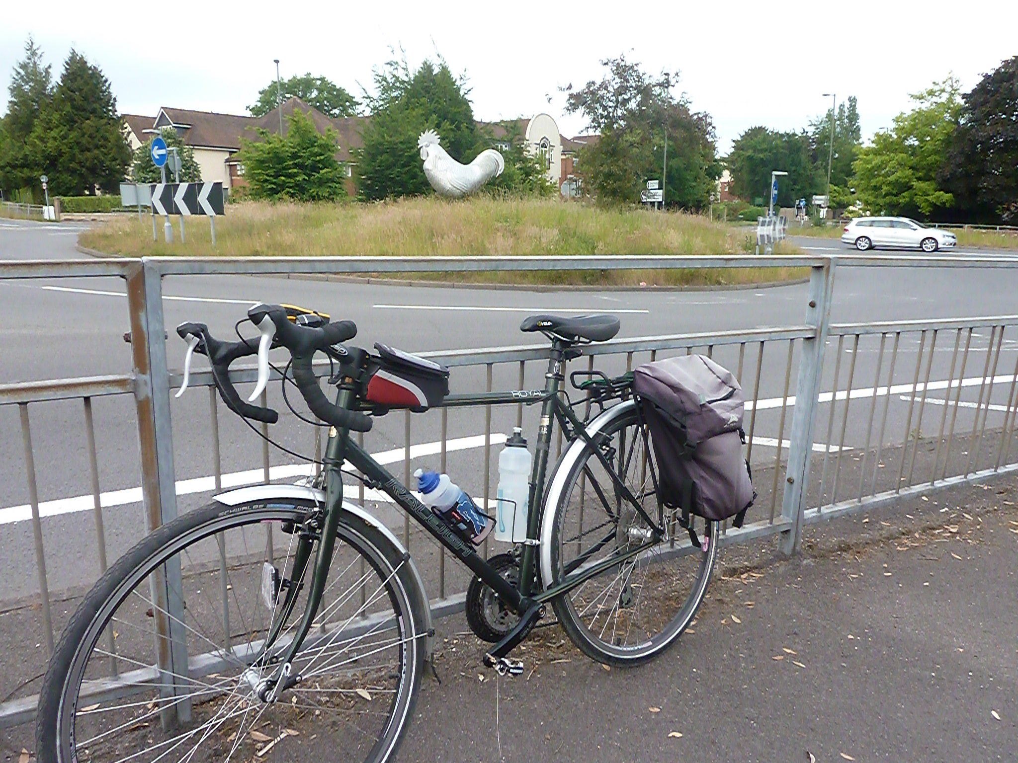 Stopping now and then to check the map, Dorking soon started to appear on signposts and the North Downs in the distance.  It was a nice feeling to know that I would not have to climb these hills today, Dorking would arrive before the hills.   A slight off road section through the middle of a golf course, under railway bridges, through allotments and along long narrow alley ways (all seemed to be a cycle route) and I finally got to the “Cock Roundabout”.    A never ending source of amusement for anyone driving along the A24 to finally come across the massive statue of a “cock”, a male chicken, standing in the middle of a roundabout.    For some reason a cockerel has been part of the coat of arms for Dorking since 1951, just why I don’t know.   This also begs the question why in 2007 a 10ft cock was put on the roundabout, apart from making anyone’s journey through Dorking a bit more amusing.    As it happened, I had arrived, on my bike, at this roundabout.  I stopped and marvelled at the statue for a while before I started to think about breakfast.