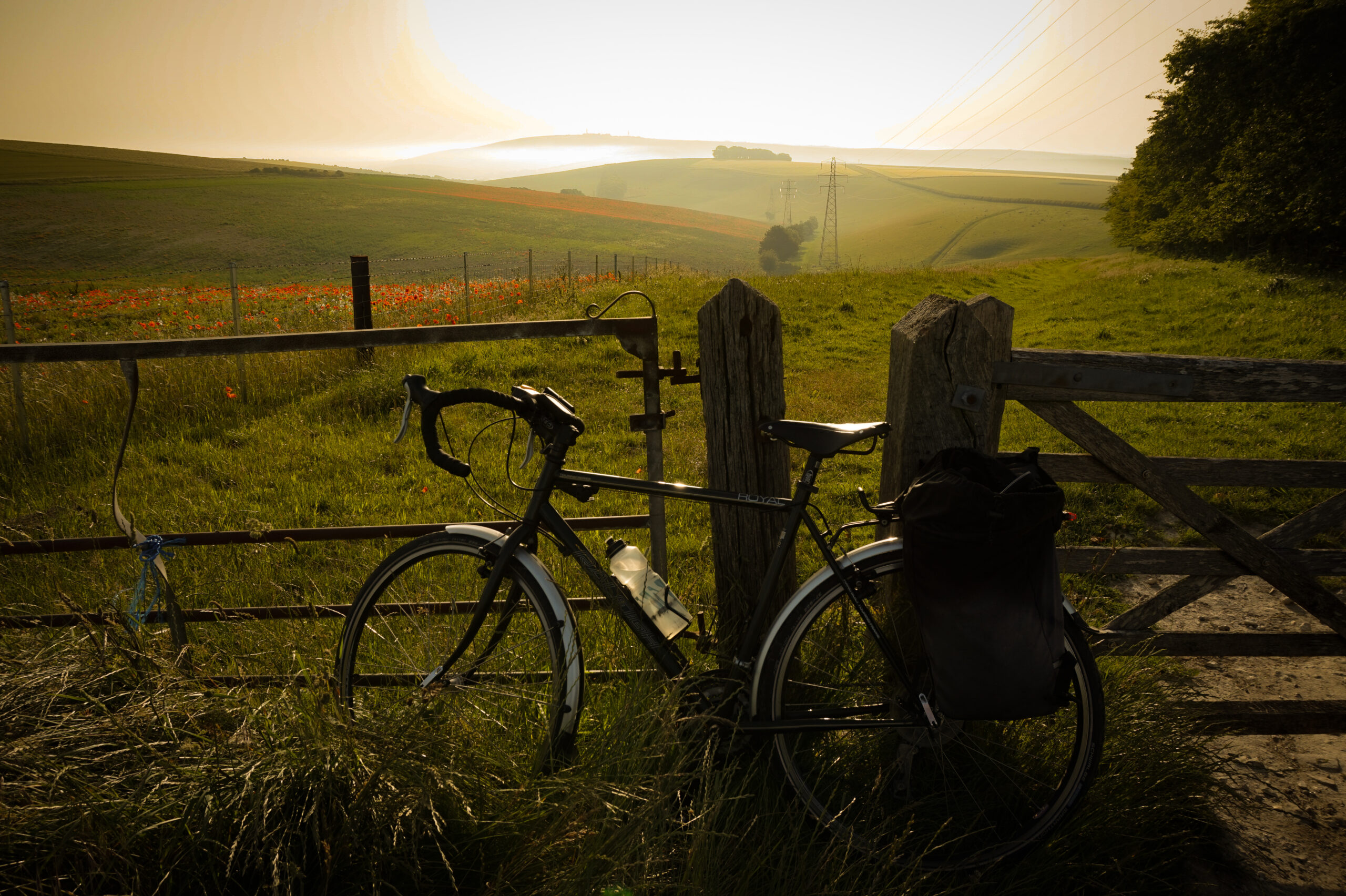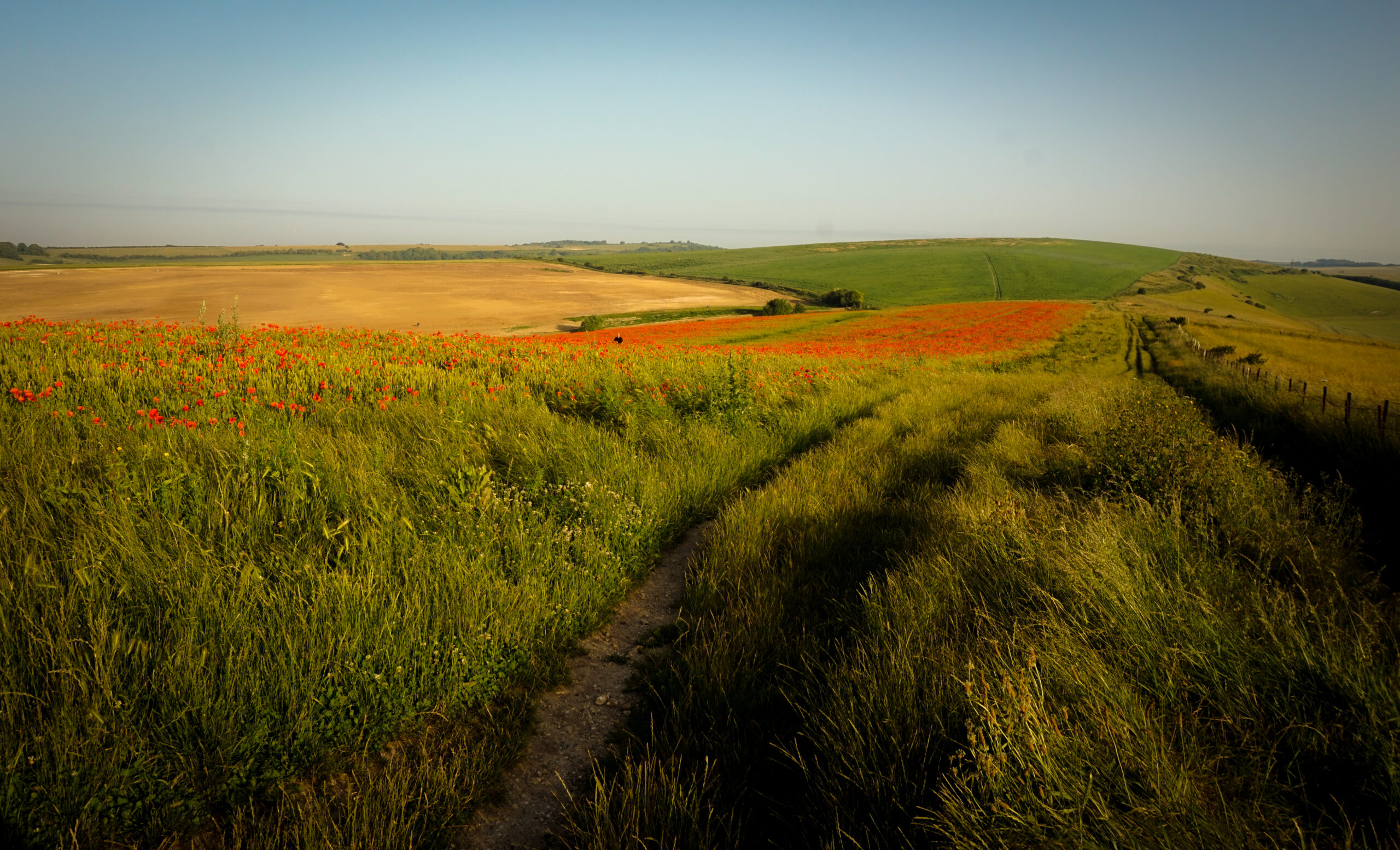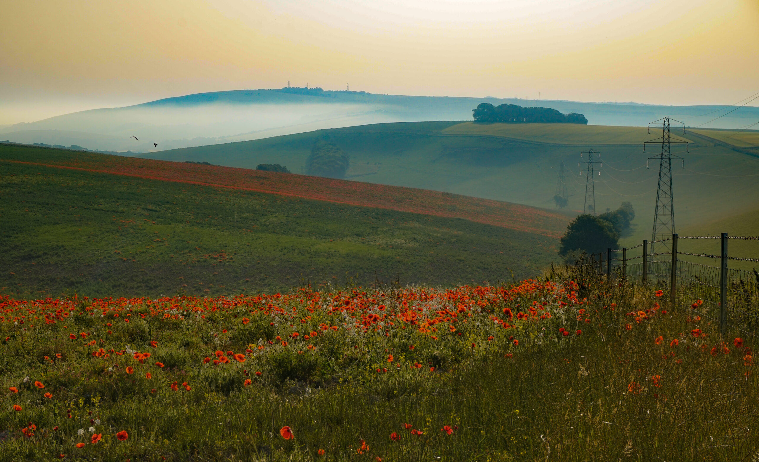 We woke up at 5:45am and were on our way by 6:10am which was pretty good going on Tom’s part. Biking up to Lancing Ring we were able to see the mist in the low areas not yet burnt off by the sun which while high’ish in the sky was comfortably cool. Passing various early morning dog walkers we good the byway around the bottom of Steep Hill and turned left to head for Cissbury Ring. We did stop for a bit to marvel at the poppy display in the fields.