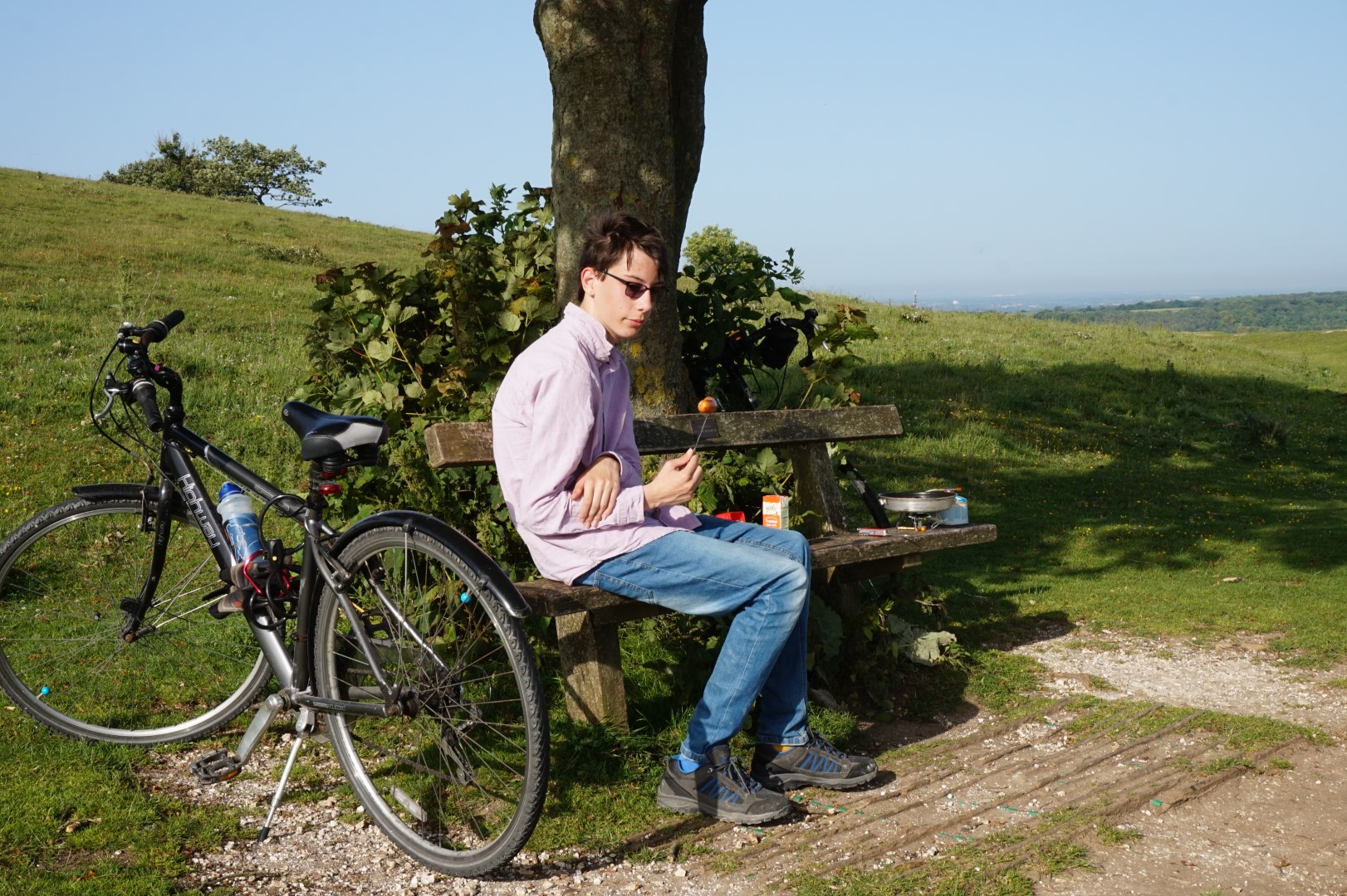 It was a couple of years ago that I first biked over to Cissbury Ring to watch the sunrise, take one or two photos and bike back in time for a couple of hours back in bed. Tom suggested it would be good to do it again but this time with him and taking breakfast… to cook. Checking the weather it looked like this weekend would be a good time, the hottest day of the year and all that. Sunrise was just after 4am still which seemed a bit unrealistic to get a teenager to agree to get up in time to bike over and watch the sun. We settled for a still rather early 6am knowing we would miss the sunrise but it would still be early enough to not be too hot, for no-one to be around much, and to be a breakfast adventure.